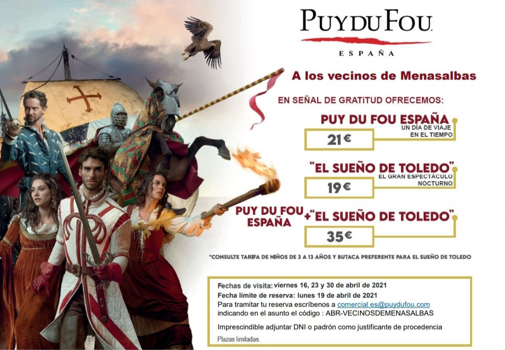 - Los viernes: 16, 23 y 30 de Abril, los vecinos de Menasalbas podrán beneficiarse de un precio especial en las entradas.
